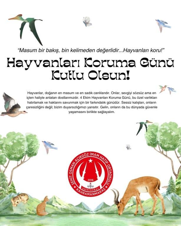 4 Ekim Dünya Hayvanları Koruma Günü vesilesiyle okulumuz öğrencilerine günün önemini vurgulamak ve farkındalık oluşturmak amacıyla Sosyal Bilgiler Öğretmenimiz Zehra Zorgün tarafından "Bir Can Dostumuzu Beslemeye Ne Dersin" başlığı adı altında mama dağıtıldı. Hem dağıtılan mamalar hayvanlara ulaştırıldı hem de öğrencilerimiz kendi imkanları hayvanlara yiyecek ve içecek dağıtımı gerçekleştirdi.
